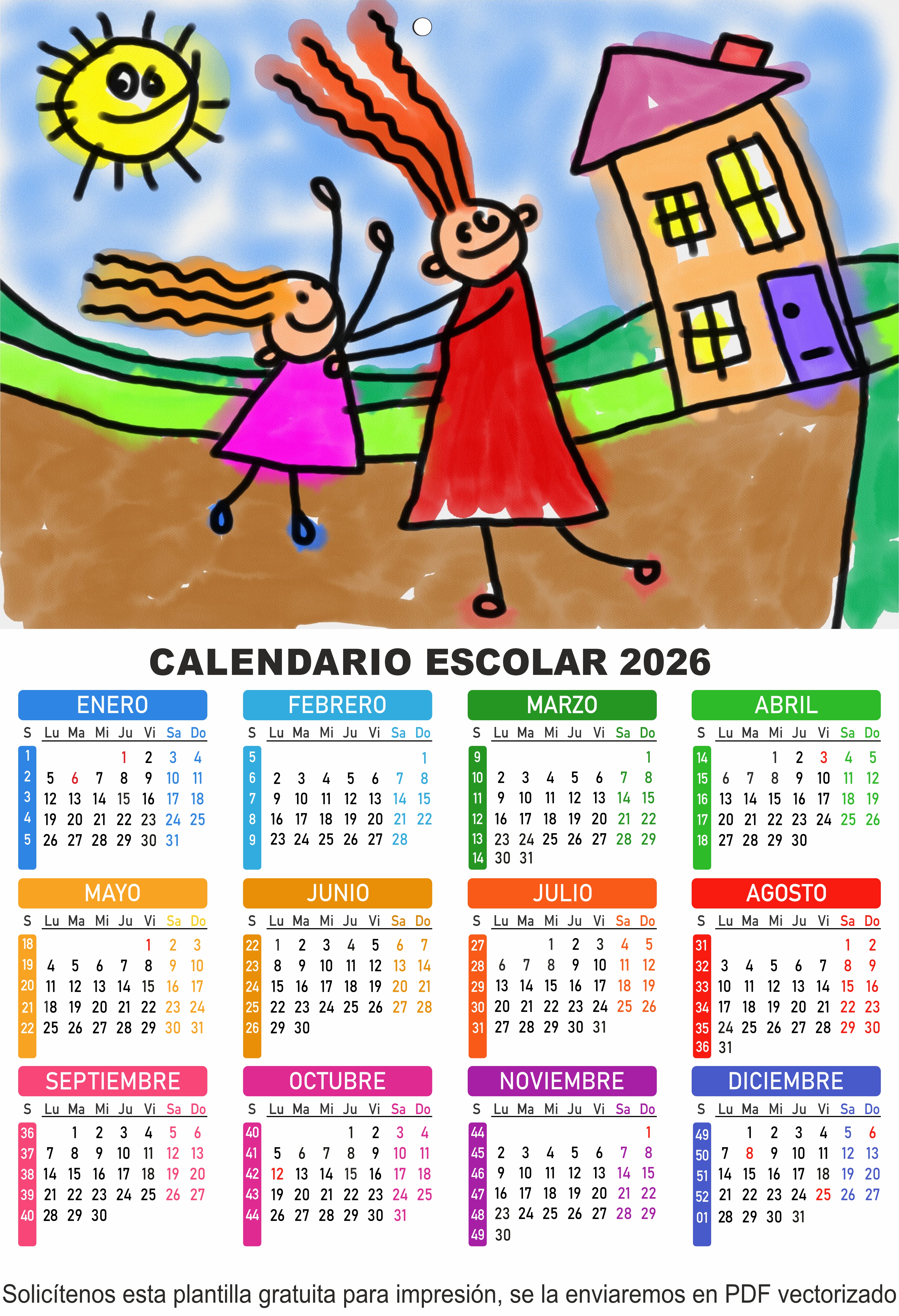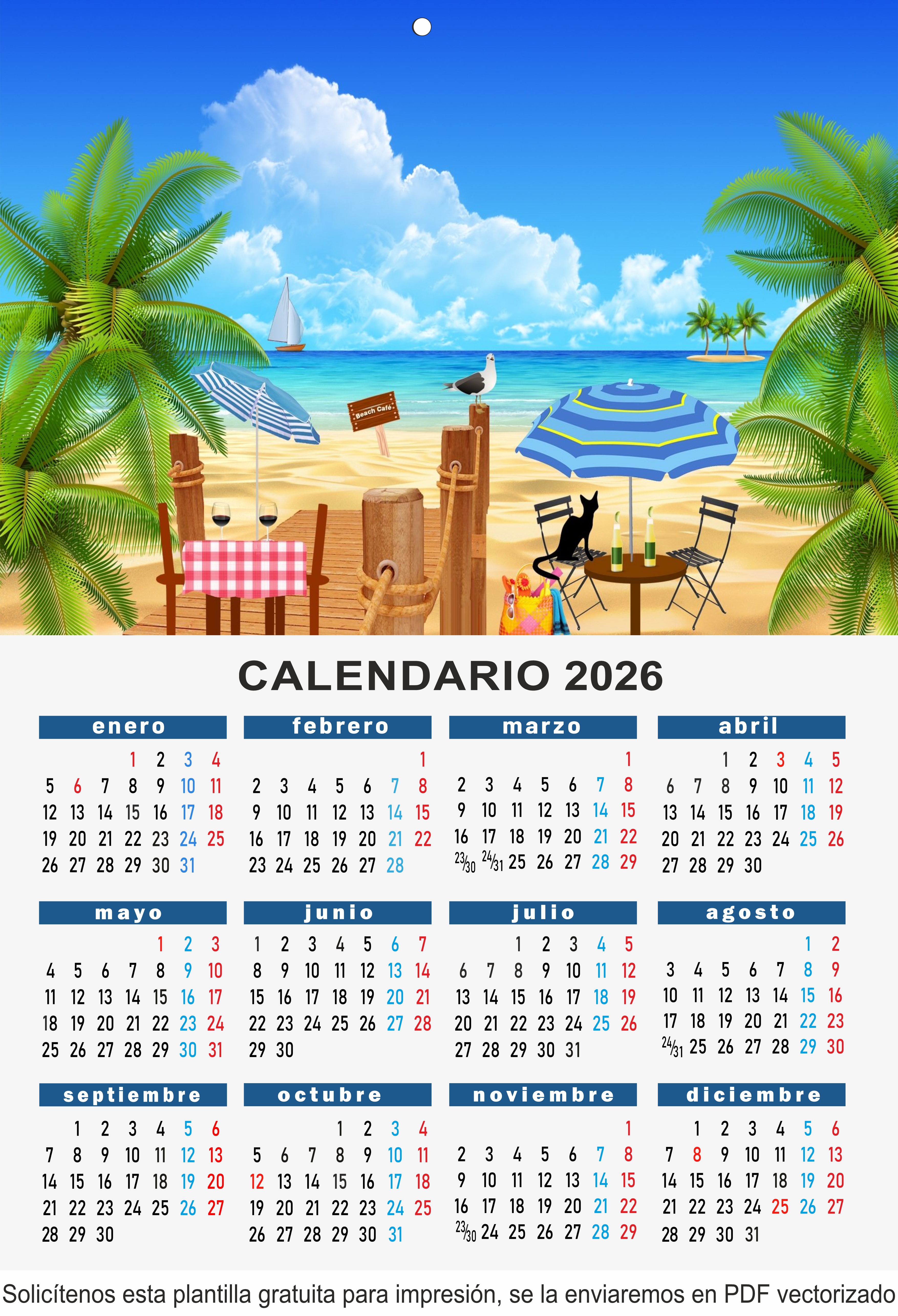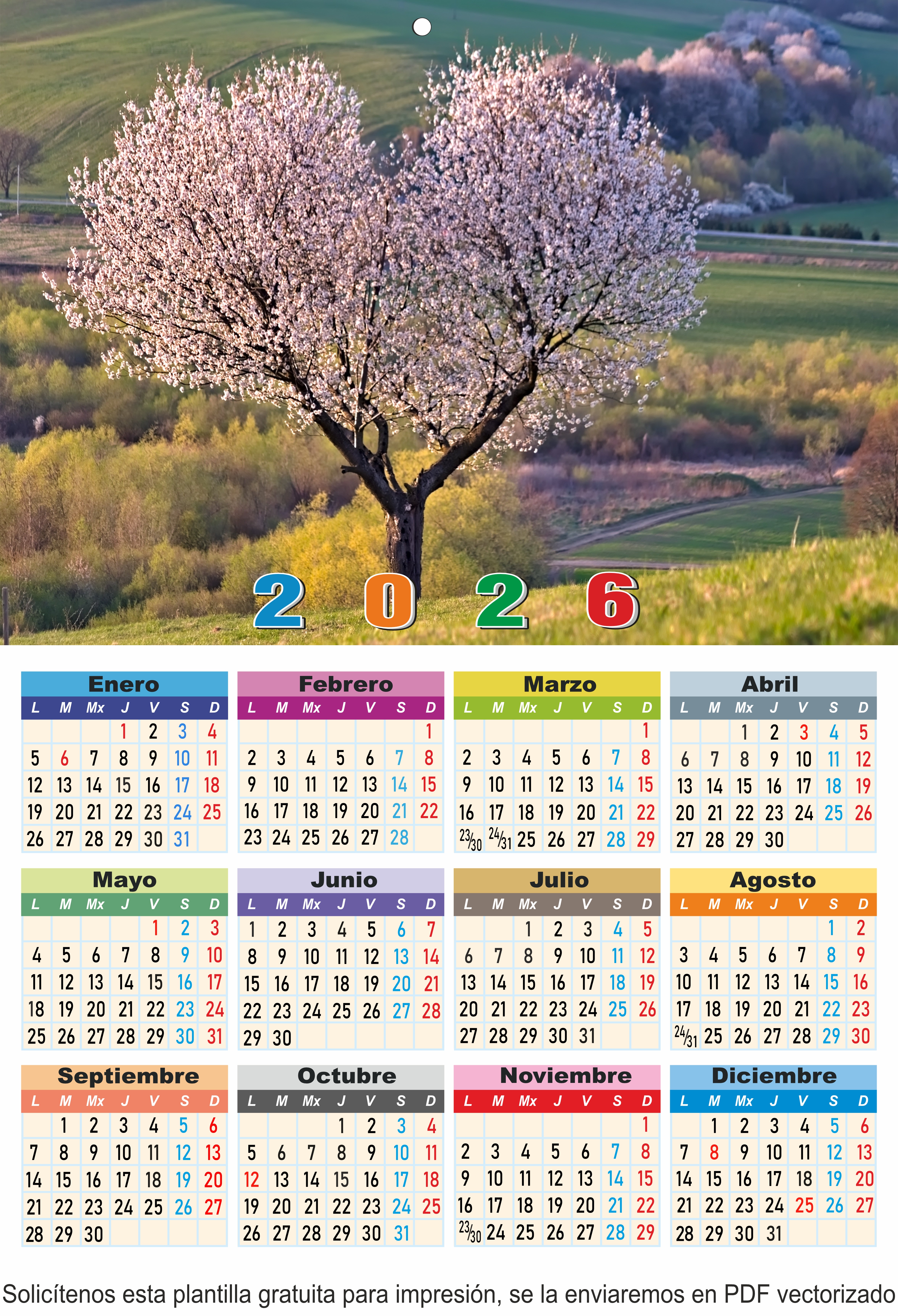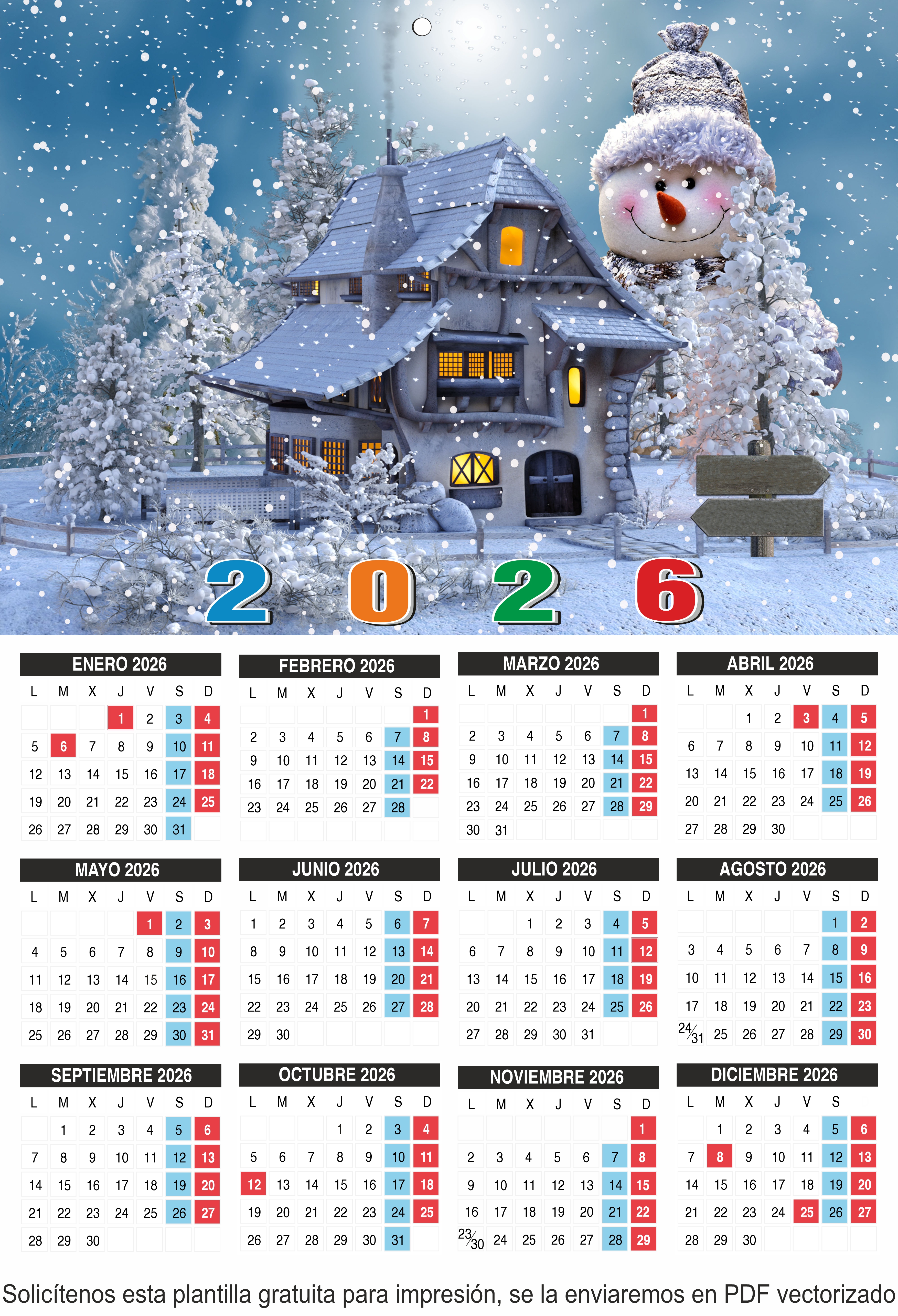 Calendario anual en lámina A3 vertical 297x420 mm, impresión color una cara en estucado brillo o mate de 300 gr, taladro superior para colgar en pared