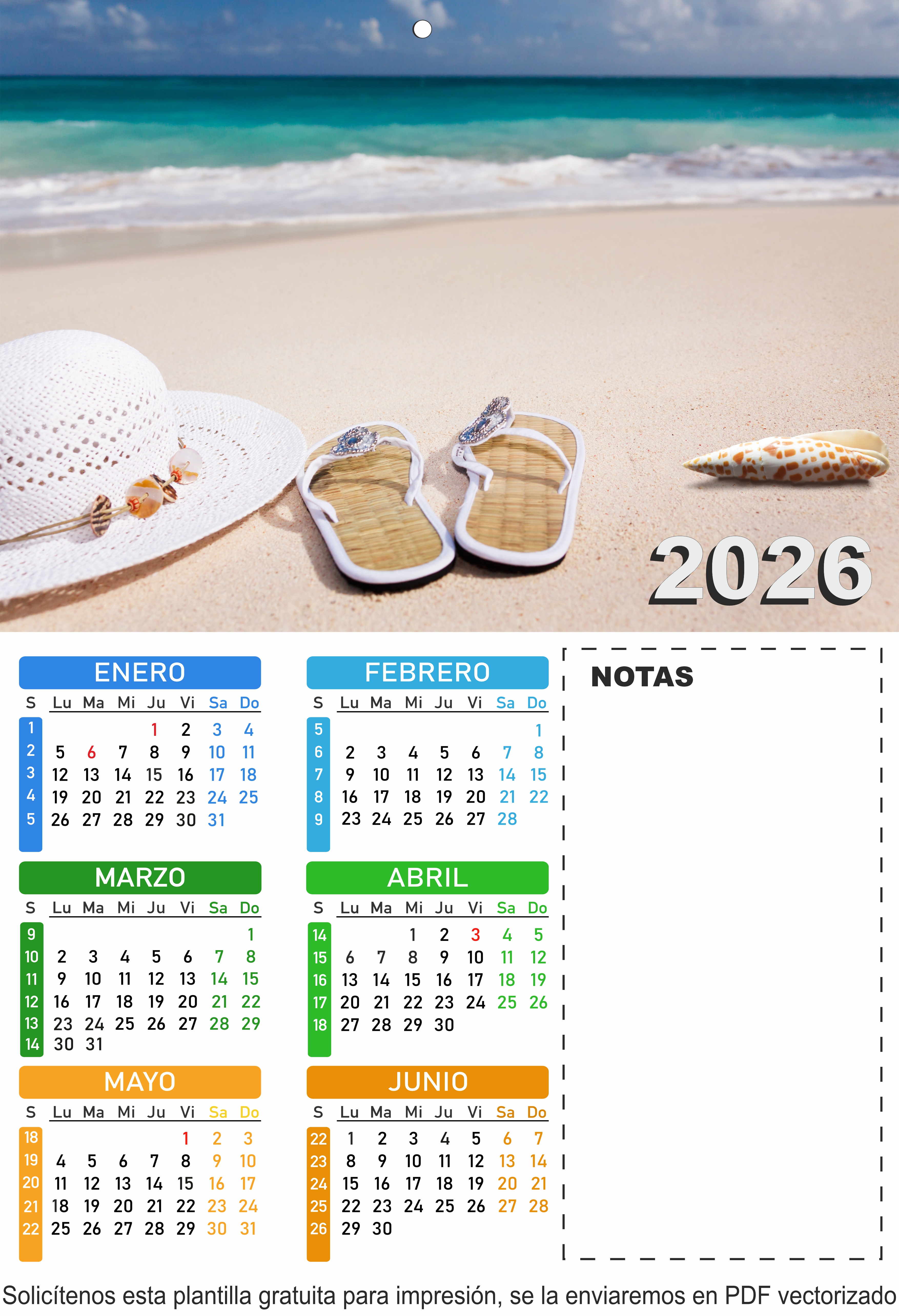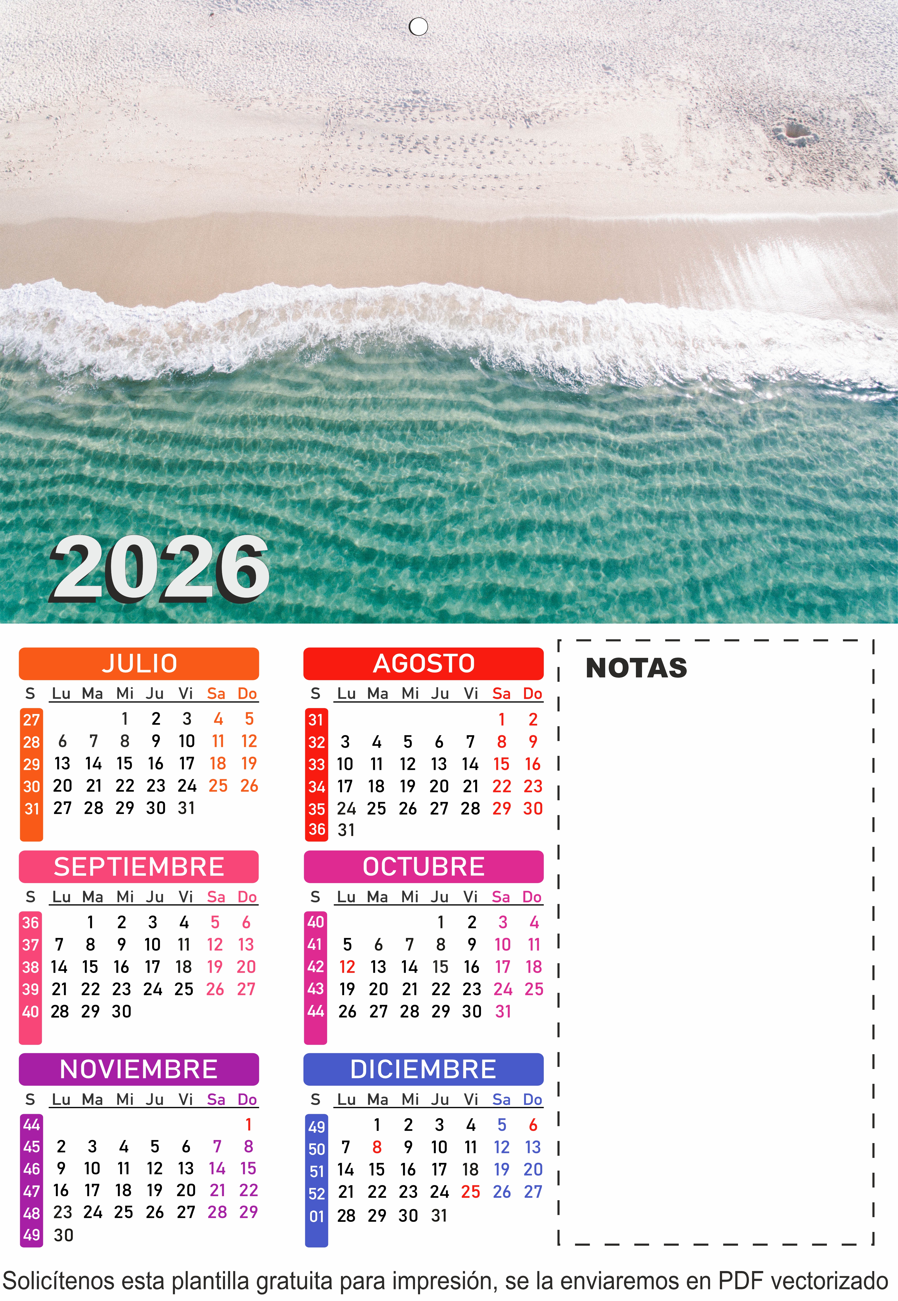 Calendario anual en lámina A3 vertical 297x420 mm, color dos caras en estucado brillo o mate de 300 gr, taladro superior para colgar en pared