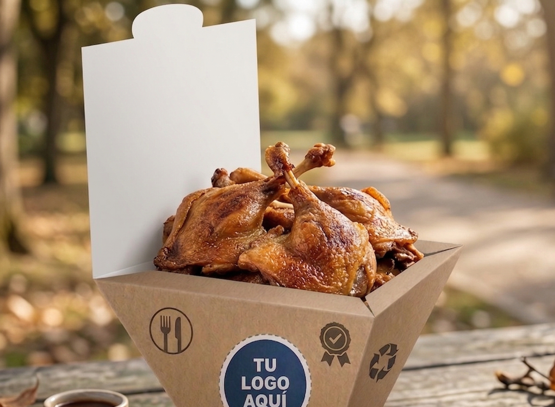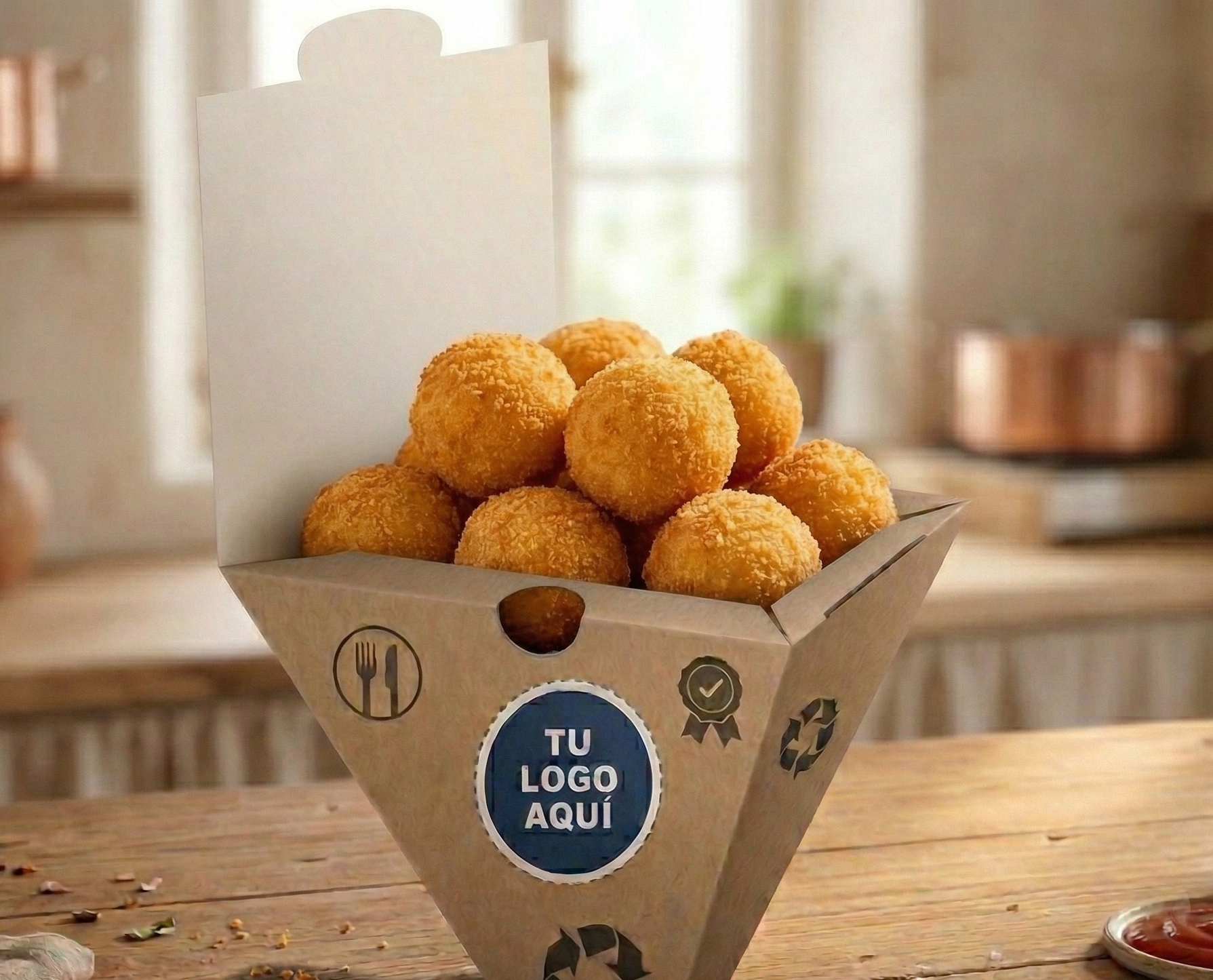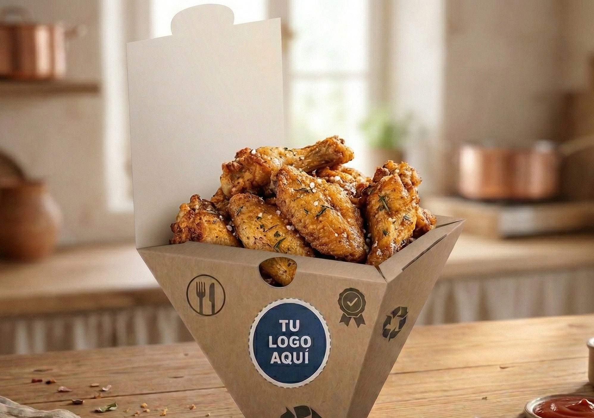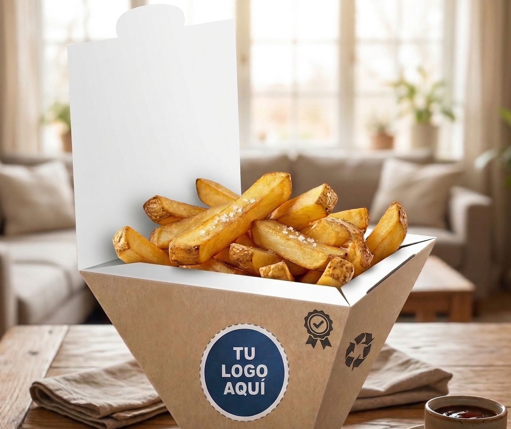 Impresión 4+0, cartón cromo ecológico 300g/m2, alta resistencia al calor, ideal para promocionarse de forma respetable contribuyendo con la mejora de nuestro entorno y la conservación del medio ambiente. "En uso alimentario integrar papel antigrasa estándar".