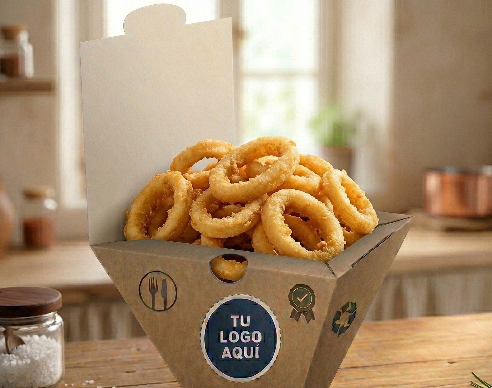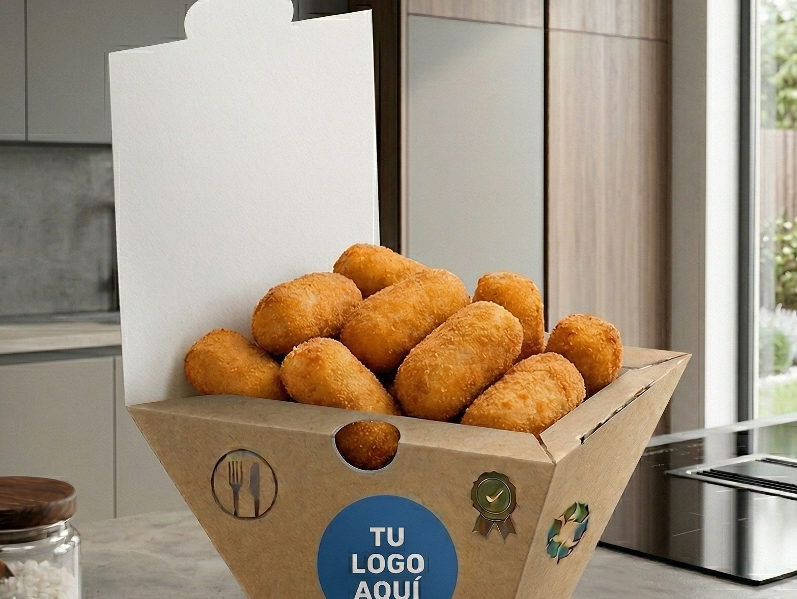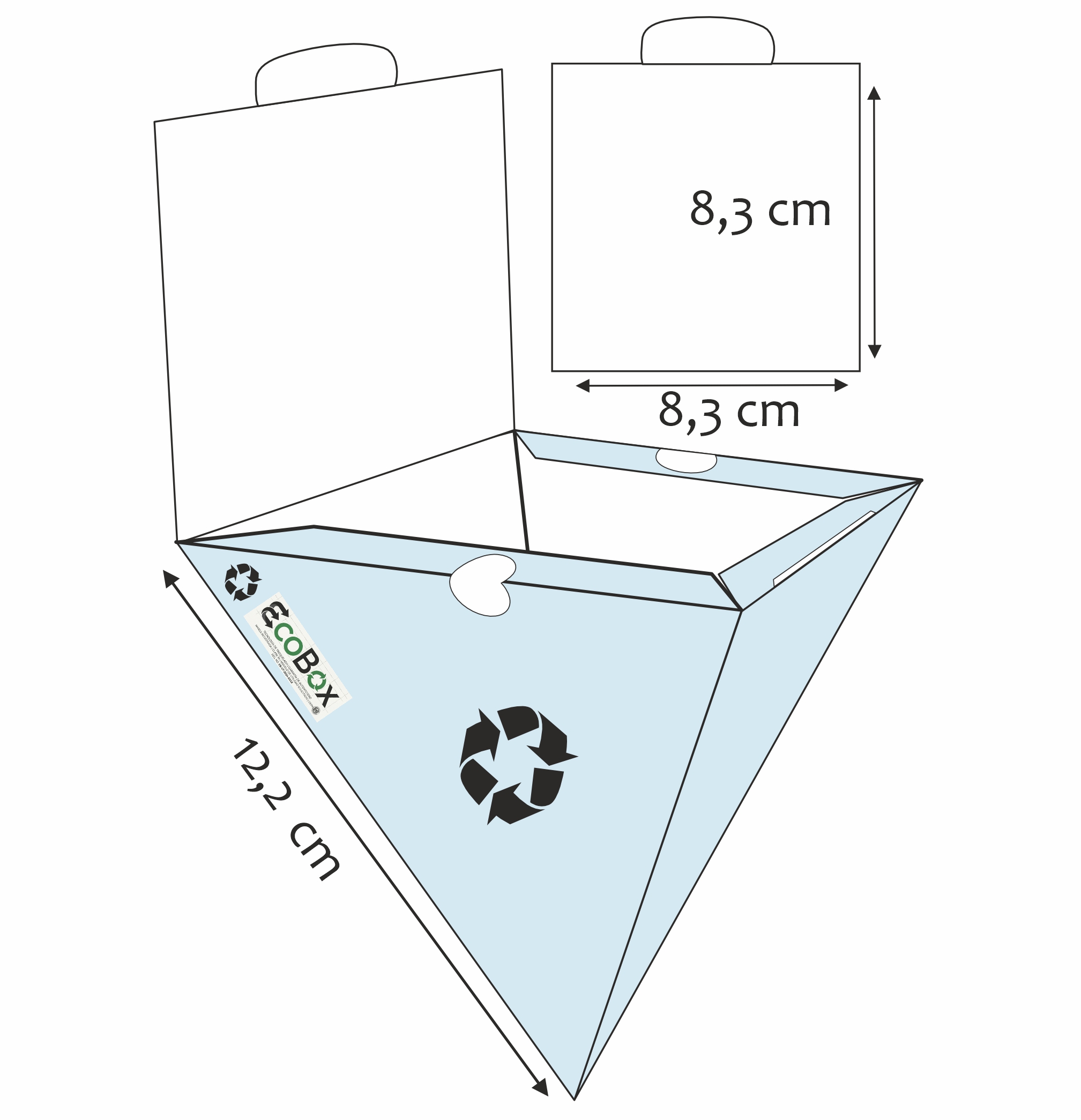 Impresión 4+0, cartón cromo ecológico 300g/m2, alta resistencia al calor, ideal para promocionarse de forma respetable contribuyendo con la mejora de nuestro entorno y la conservación del medio ambiente. "En uso alimentario integrar papel antigrasa estándar".