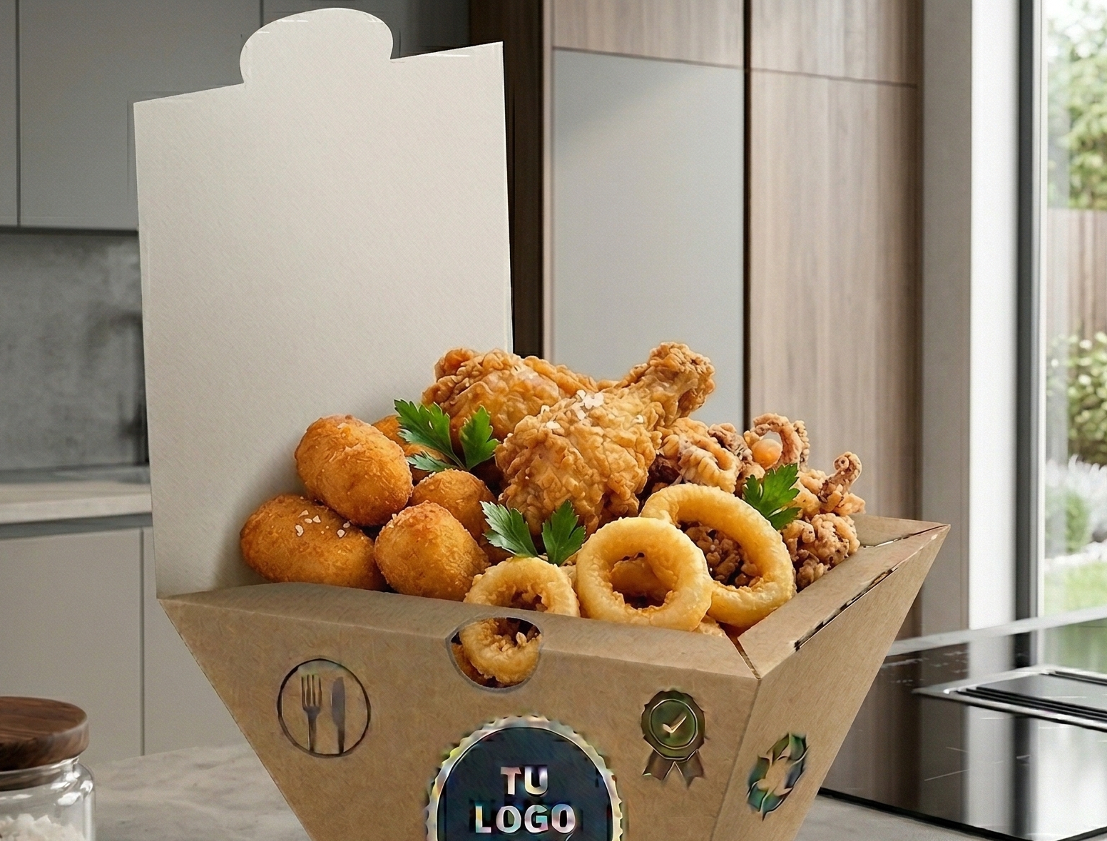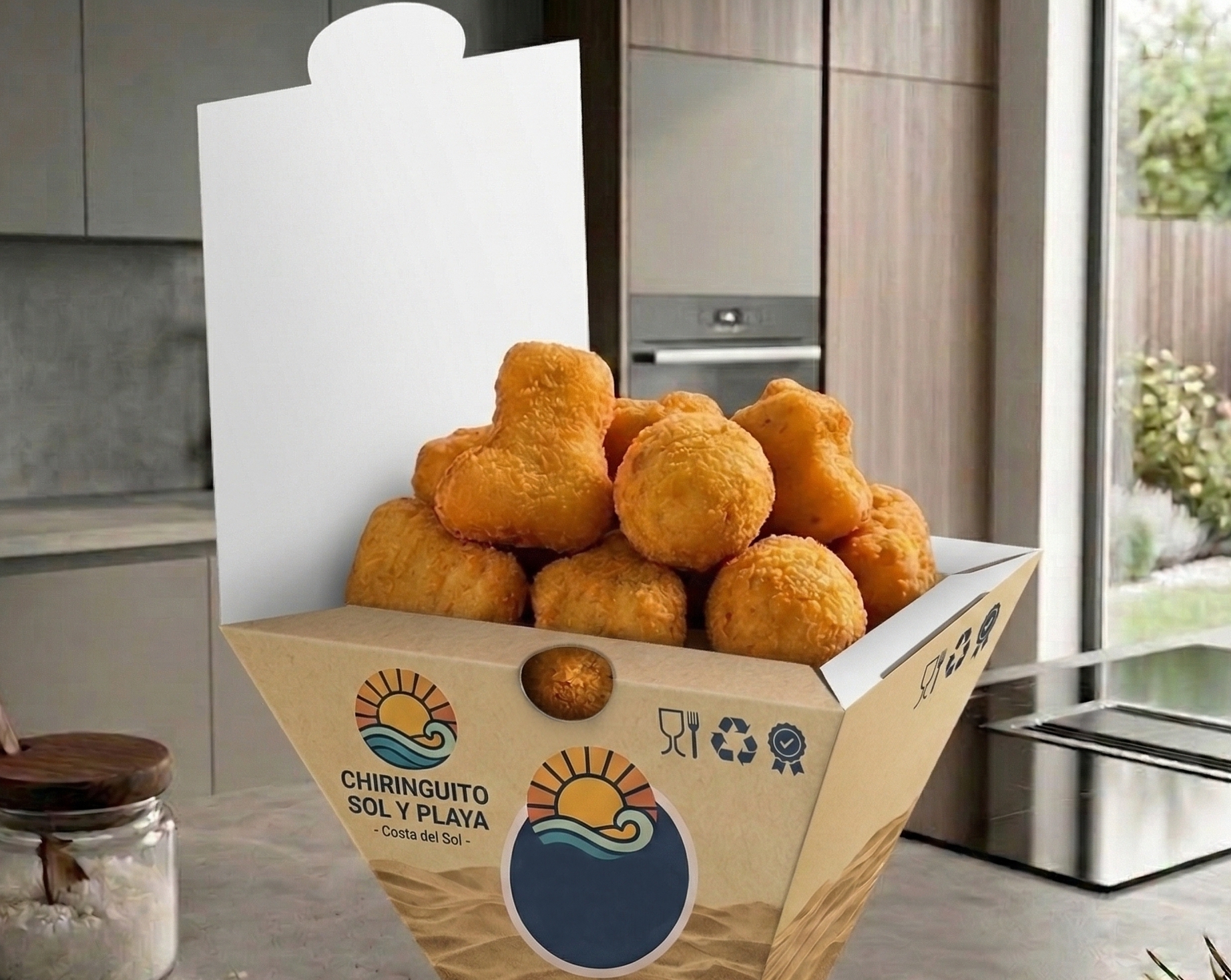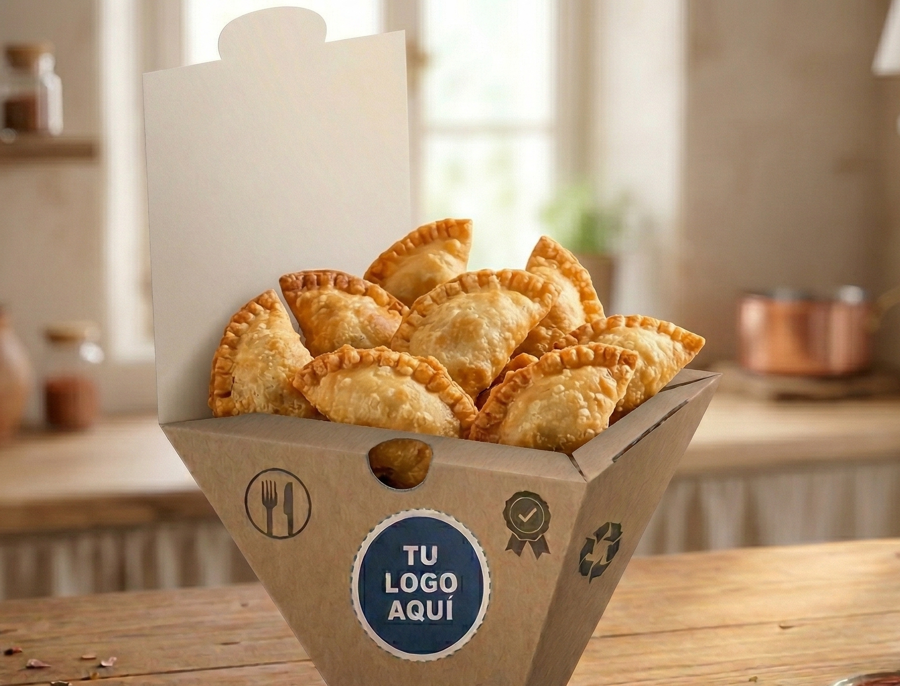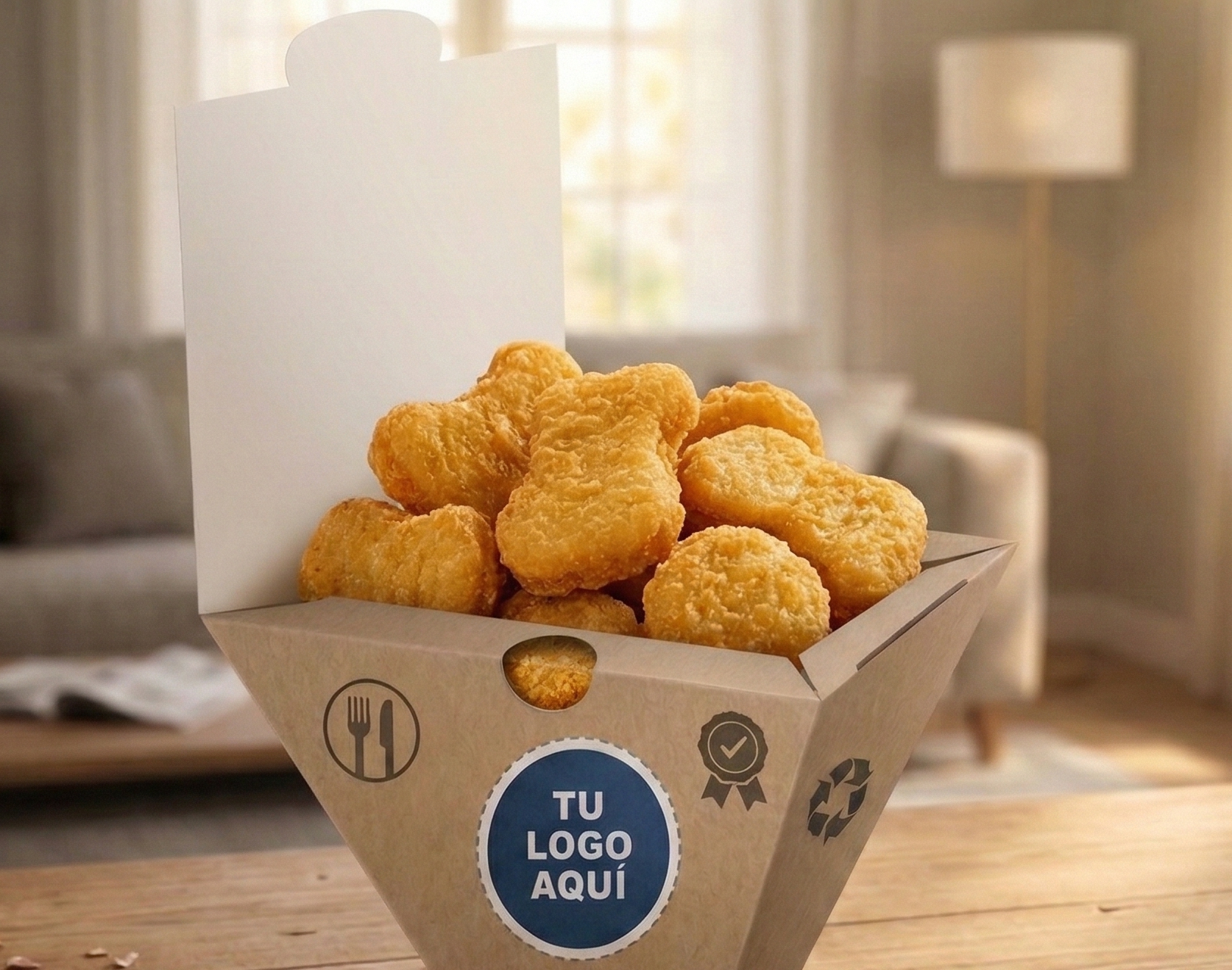 Impresión 4+0, cartón cromo ecológico 300g/m2, alta resistencia al calor, ideal para promocionarse de forma respetable contribuyendo con la mejora de nuestro entorno y la conservación del medio ambiente. "En uso alimentario integrar papel antigrasa estándar".
