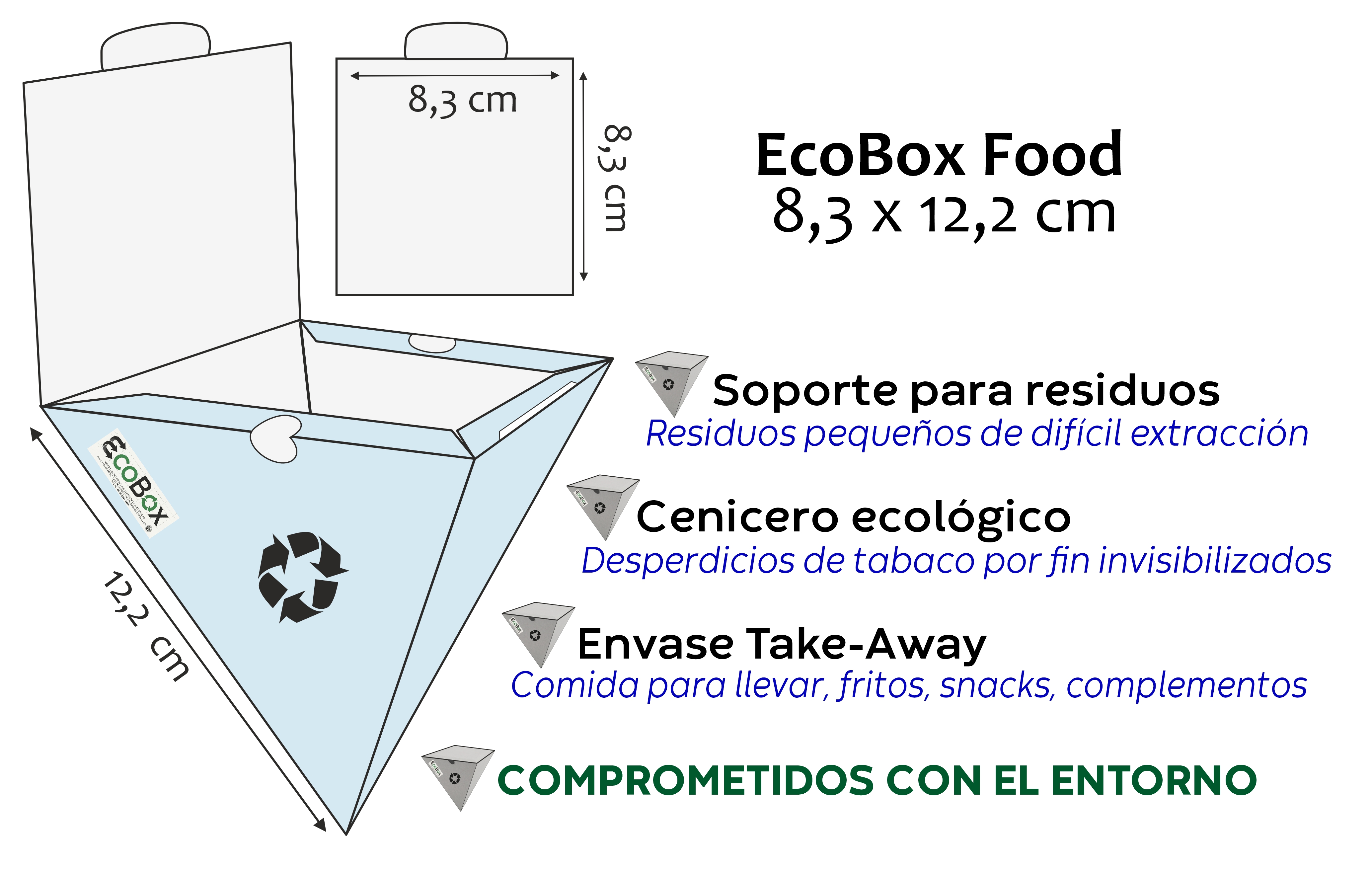 Especial take-away (ideal para finger food) envase porta alimentos, opción para residuos y cenicero, tapa y cierre fácil, 4+0, cartón cromo GC 320 gr, contribuye con la mejora del entorno y el medio ambiente.